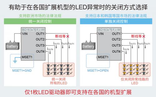 新产品内置有控制方式选择功能,当 LED 发生异常时,可选择所有通道关闭或单通道关闭。例如,当 1 路尾灯因断线等原因不亮时,可选择关闭其他所有的通道或者仅关闭断线的通道。各国发生异常时的两轮机动车牌照灯的安全标准不同,新产品可通过一种设置对应众多国家和地区的法律法规,因此在各国进行机型扩展时,可减少重新设计工时。