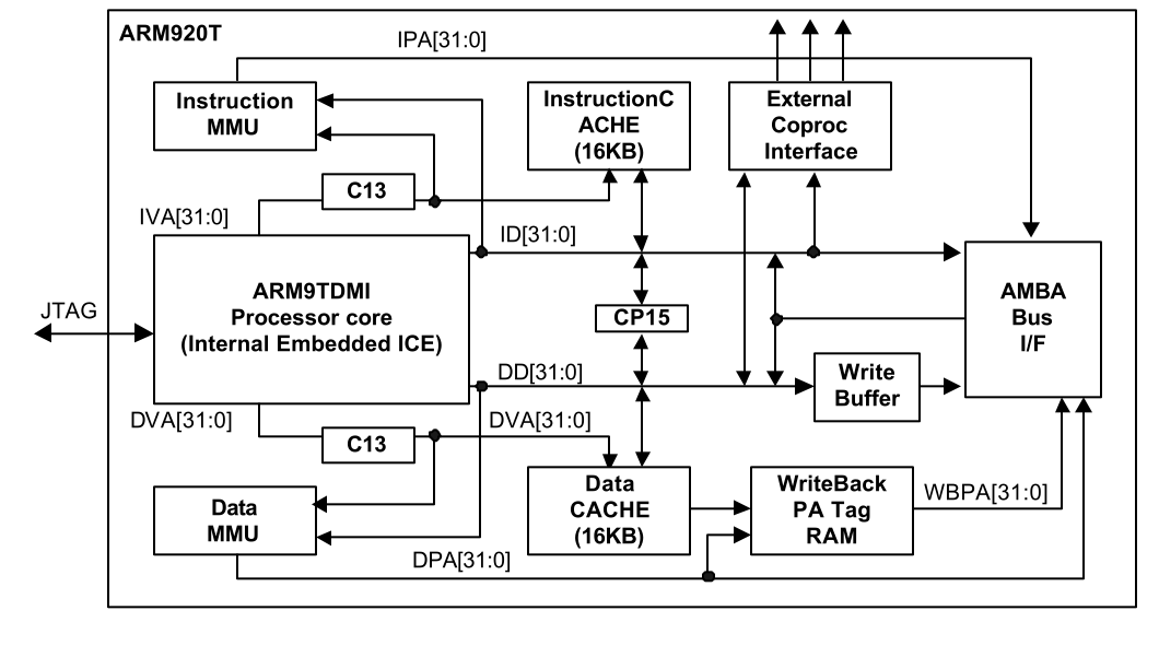 S3C2440处理器的结构如下图所示,其核心单元为ARM9TDMI处理器核,主要包括16K的指令Cache和16K的数据Cache,以及分开的指令和数据MMU单元等。CP15为一个协处理器(Co-Processor)。通过AMBA2.0(Advanced Microcontroller Bus Architecture)总线接口与外部设备相连。