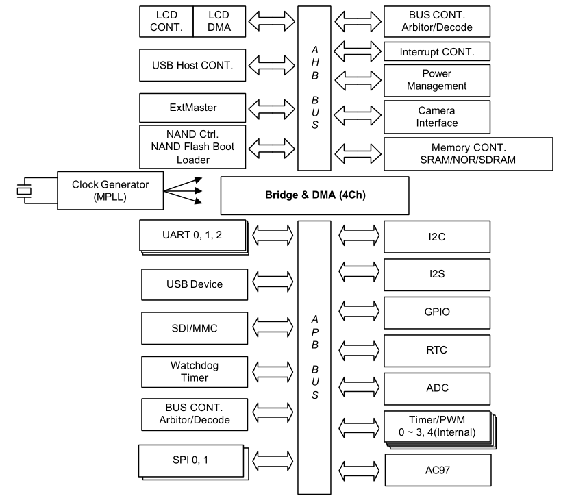 APB总线上挂载各种外设,包括3个UART,USB设备,SDI/MMC卡,看门狗定制器,总线控制器、仲裁器和译码器,2个SPI总线,I2C总线,I2S总线,GPIO接口,RTC实时时钟,ADC模数转换器,定时器/PWM发生器,AC97音频编解码器。