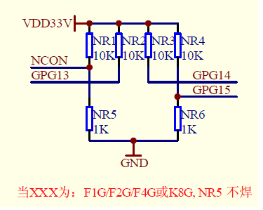 TQ2440上对Nand Flash控制器的配置引脚连接如下,在开发板上使用的Nand Flash型号为K9F2G08U0A,故NR5电阻不焊接。
