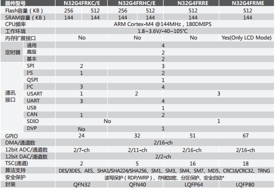 采用 32 bit ARM Cortex-M4 内核、集成最大容量144KB SRAM,512KB Flash, 集成多达18 个数字通讯接口及4个模拟接口。如下是详细的产品参数表: