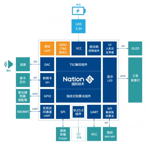 提供“国民技术 MCU+指纹算法+TSC 触控+蓝牙”单芯片方案