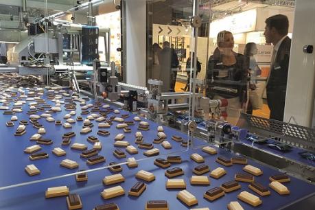 这次展会上看到的 lightline Flowpacker(预配置型集成式枕式包装机) 将把夹心饼干和巧克力的饼干直接或放入托盘后包装成枕包。
