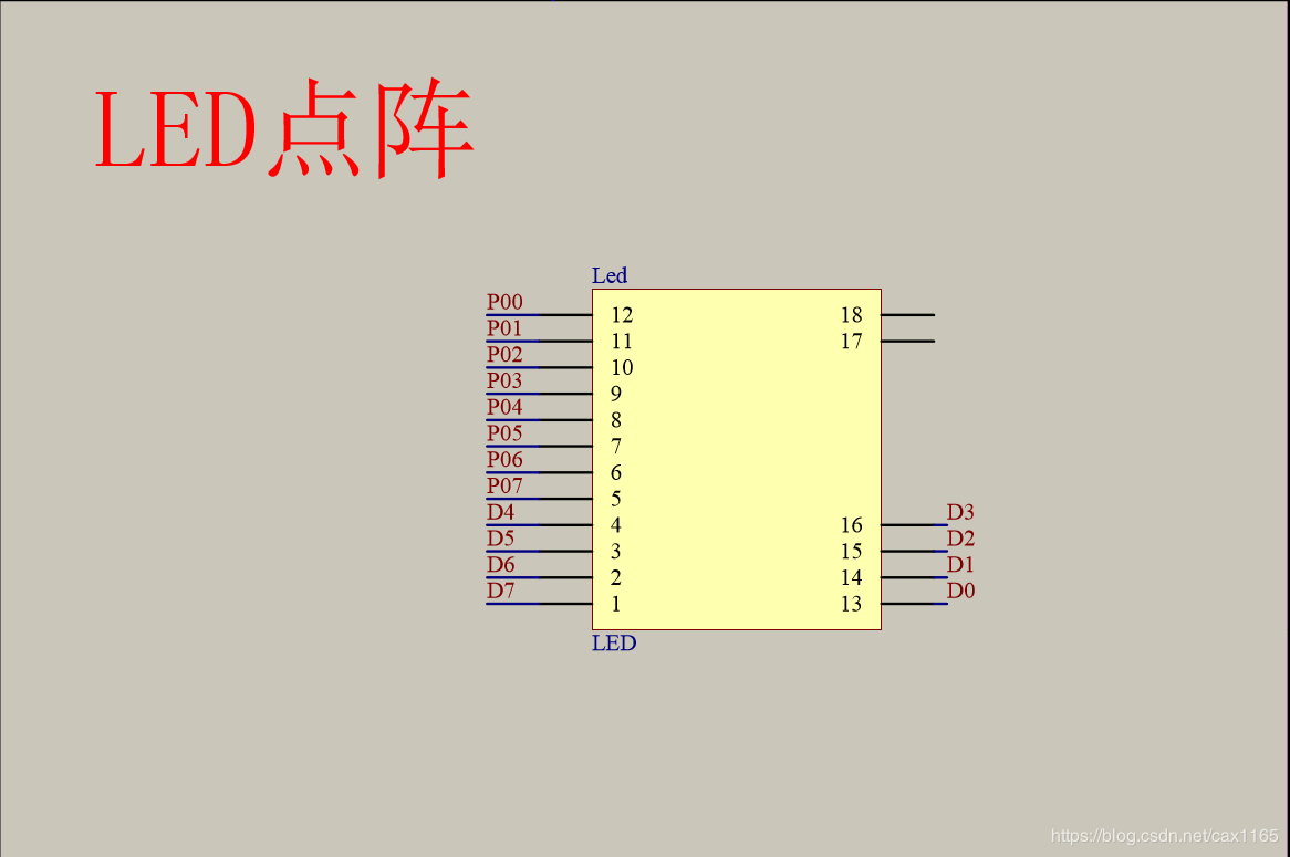 D0口到D7口依次控制点阵的第8到1行(注意顺序),P0^0到P0^7口依次控制点阵的第8到1列(注意顺序)。
