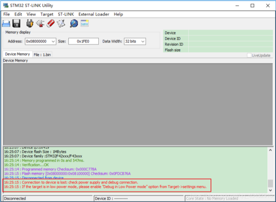 使用STM32F429,STlink下载程序,keil for arm进行编程,原本一切正常,下载了一次程序之后,在keil中再也找不到设备,但是STLink显示驱动、连接等一切都正常,使用STM32 ST-LINK Utility工具也能正常连接,但同样的程序还是下载不进去,如下列图所示: