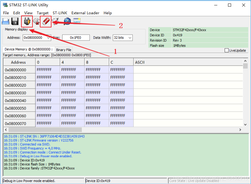 因为keil不能下载程序了,芯片中因为之前下过一次当前程序之后才不能再下载程序的,所以一上电就在跑当前的程序,所以先使用STM32 ST-LINK Utility工具将之前芯片中的程序擦除: