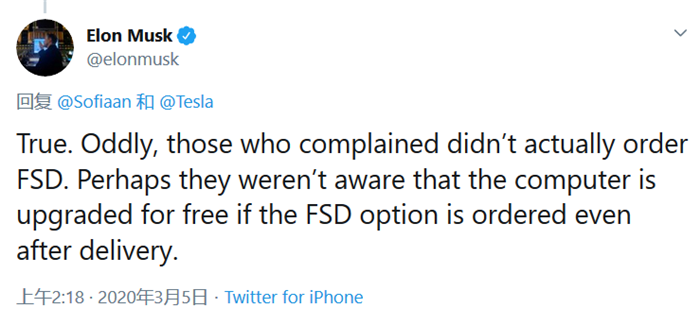 而对此身为特斯拉CEO的马斯克看样子是毫不在意,就在3月5日,马斯克就“减配门”事件在推特上发文称:“想来那些投诉的车主或许根本不知道FSD,事实上那些车主也并没有订购FSD,其实只要在车辆交付后又订购了FSD,那么车辆的车载计算机将是可以免费升级的”想来马斯克是弄不懂为啥中国民众这么愤怒,而对于此番话语,很明显有着甩锅加推销的嫌疑,产品当然可以推荐,但是使用这种偷换概念的推销方式就是大错特错了,消费者对于这件事情的怒火程度可想而知。