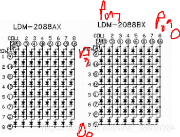 8*8的LED点阵电路如图一所示,有两种方式。单片机上集成的电路方式为第二种。
