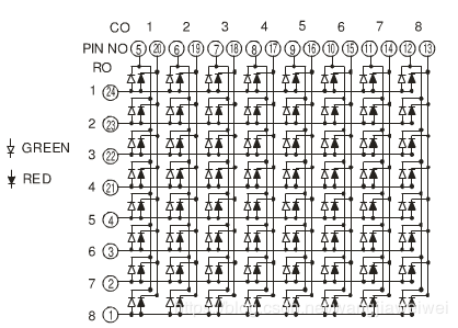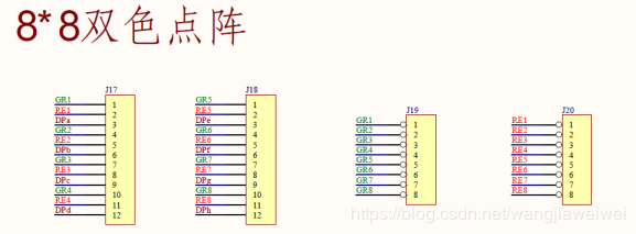 实验板用的是共阴极双色点阵,开发板的点阵电路图如下: