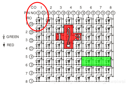 共阳极双色点阵点亮点阵和共阴极双色点阵基本类似,只是上述操作中需要将高电平的操作改成低电平,低电平操作改成高电平