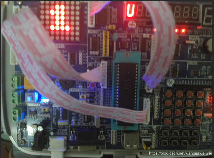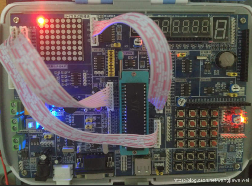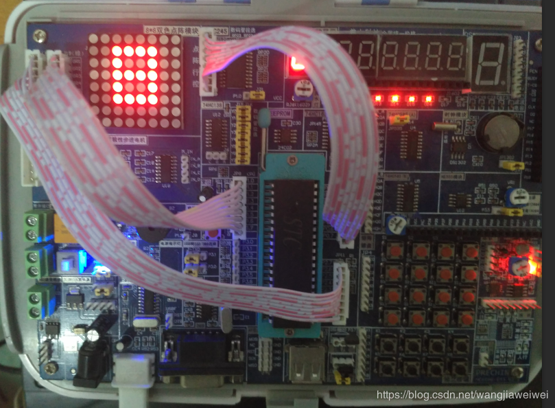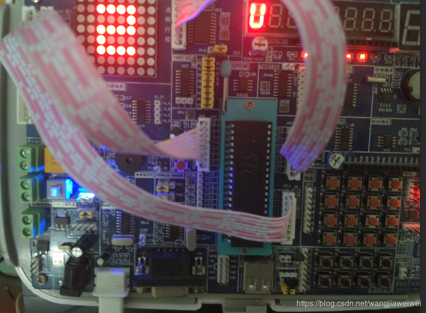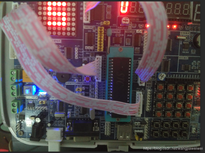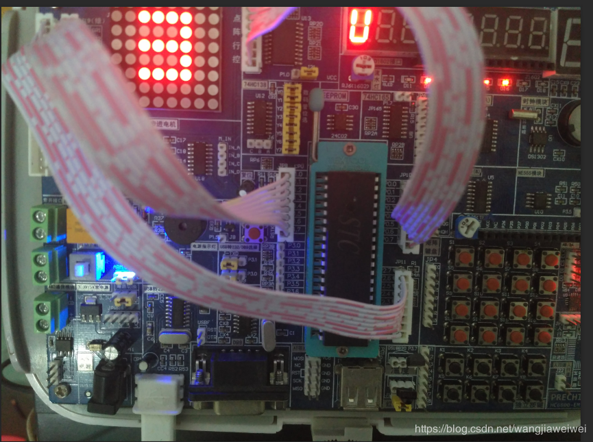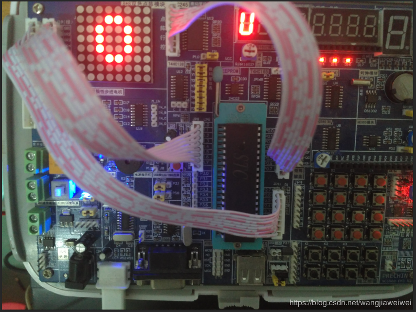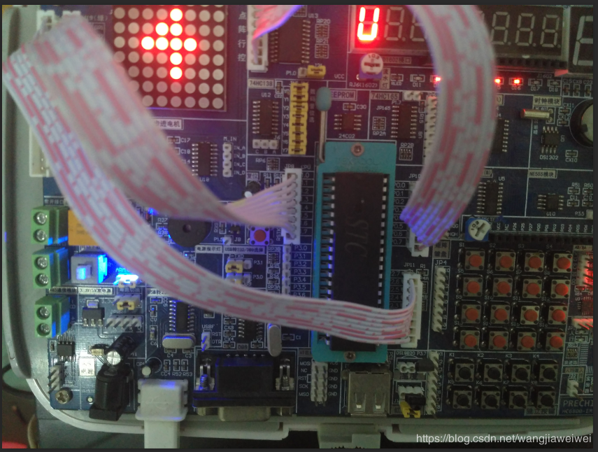 P0口与J12口要反插、P1口与J19口反插、P2口与J20口正插,如果排线插反了,则点阵点亮的位置就会和程序里设置的相反。
