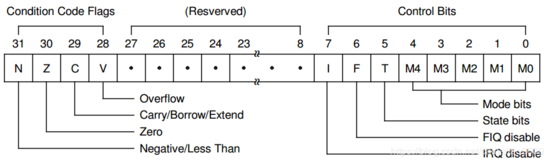 怎么让CPU工作于某种模式,可以通过设置CPU的CPSR寄存器。CPSR寄存器格式如下: