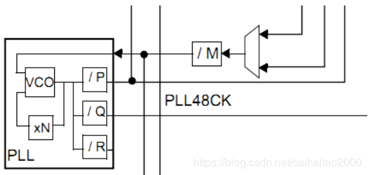 从图2可以看出。主PLL时钟的时钟源要先经过一个分频系数为M的分频器,然后经过倍频系数为N的倍频器出来之后还需要经过一个分频系数为P(第一个输出PLLP)或者Q(第二个输出PLLQ)的分频器分频之后,最后才生成最终的主PLL时钟。