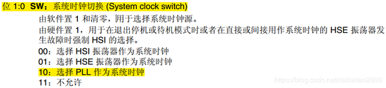 SystemInit()函数开始先进行浮点运算单元设置,然后是复位PLLCFGR、CFGR寄存器,同时通过设置CR寄存器的HSI时钟使能位来打开HSI时钟。默认情况下如果CFGR寄存器复位,那么是选择HSI作为系统时钟,这点大家可以查看RCC->CFGR寄存器的位描述最低2位可以得知,当低两位配置为00的时候(复位之后),会选择HSI振荡器为系统时钟;也就是说,调用SystemInit()函数之后,首先是选择HSI作为系统时钟。下面是RCC->CFGR寄存器的位1:0配置描述(CFGR寄存器详细描述请参考《STM32F4 中文参考手册》6.3.31 CFGR寄存器配置表)如下表1: