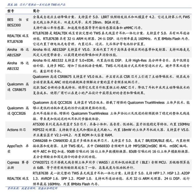 (二)中低端市场:传统芯片玩家广泛布局1、络达:支持蓝牙5.0+蓝牙增强速率络达成立于2001年,是联发科为进一步布局物联网市场,在2017年花13亿美元收购的功率放大器(PA)公司。在蓝牙芯片领域,络达研发了AB1526P、AB1532和AB1536等多款蓝牙芯片,客户覆盖飞利浦、联想、漫步者和海威特等厂商。其中,AB1532芯片支持蓝牙5.0+EDR(Enhanced Data Rate,蓝牙增强速率),内置高性能信号处理(DSP),增加了低功耗语音唤醒。音质方面,它还支持High-Res高分辨率音乐和高中低频自动补偿,支持多MIC。2、恒玄:采用28nm工艺,BGA封装技术相比于络达,成立于2015年的恒玄还是一个较为年轻的IC设计公司,主要研发无线音频平台RF SOC芯片。针对TWS耳机市场,恒玄自2016年其推出了BES2000系列芯片,并在2018年还发布了BES2300蓝牙芯片,华为Freebuds、华为Freebuds 2、荣耀FlyPods和魅族POP等TWS耳机均采用其解决方案。据悉,BES2300采用28nm制程工艺,以及BGA(Ball Grid Array)封装技术,支持外接传感器设备和eMMC闪存。另外,它还支持蓝牙5.0标准,以及低频转发技术和双模蓝牙4.2,采用了自适应主动降噪方案,技术,支持第三代FWS全无线立体声技术、双麦克风等。3、紫光展锐:TWS芯片新晋玩家,延时降低超30%作为国内重要的IC设计和研发厂商,长期以来在基带芯片、AIoT芯片和无线连接芯片领域已有着较为深厚的积累和经验。2019年,紫光展锐正式推出了春藤5882蓝牙芯片,该芯片支持蓝牙5.0标准,拥有低功耗性能,连续播放续航长达4小时以上。在延时方面,春藤5882的双耳延时与市场平均水平相比降低了30%以上。同时,该芯片还拥有双主耳效果,支持无缝切换,进一步提升用户的切换体验。据了解,搭载春藤5882蓝牙芯片的相关产品已在2019年量产上市,然而紫光展锐并未透露具体客户信息。