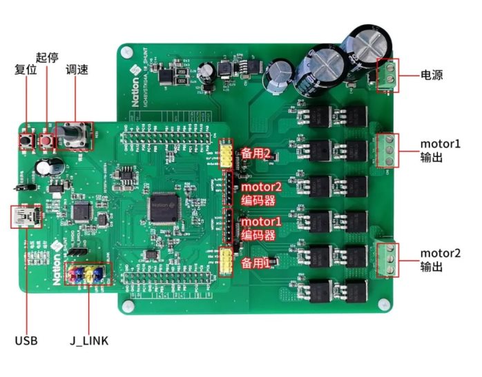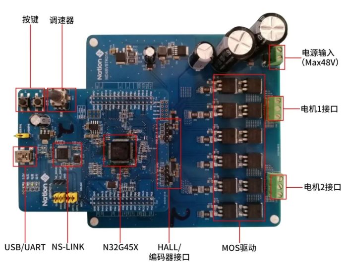 为方便用户评估,国民技术提供基于N32G455控制芯片的电机评估板,该评估板由相互分离的驱动板(包含双电阻双FOC驱动板、单电阻双FOC驱动板)和控制板组成,用户可以自由组合出相应的电机验证平台,该开发套件支持无感FOC应用评估、HALL位置检测FOC应用评估、编码器位置检测FOC应用评估。