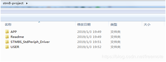 2、新建一个文件夹,本例子命名为stm8-project,新建四个子文件夹,分别命名为APP、Readme、USER、STM8S_StdPerph_Driver: