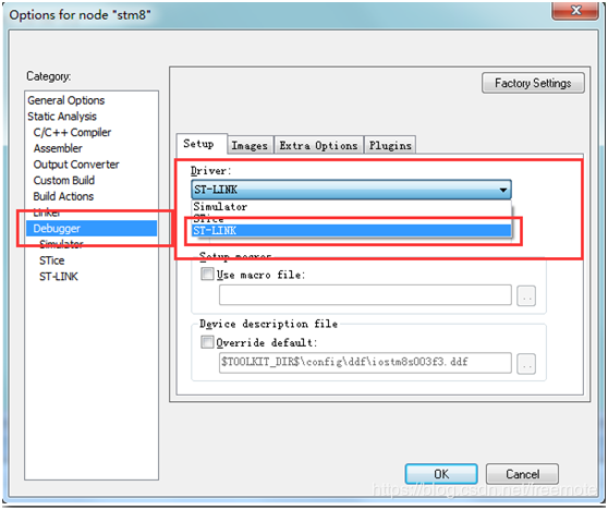 22、右击工程名称,选择options…,选择Debugger,这里我们选择STLINK: