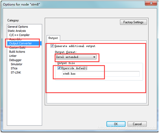 21、右击工程名称,选择options…,选择Output Converter,这里我们选择生成hex文件: