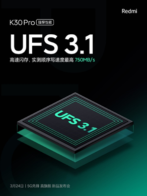 卢伟冰透露Redmi K30 Pro采用了UFS 3.1闪存标准,Write Turbo技术把顺序读写速率最高提高到了750MB/s,还加入了全新省电技术,让终端更省电。
