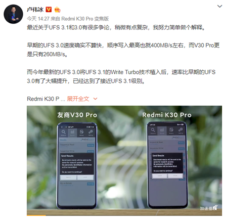 Redmi品牌总经理卢伟冰也在微博简单介绍了UFS 3.1和3.0,他表示最近关于UFS 3.1和3.0有很多争论,稍微有点复杂,我努力简单做个解释。