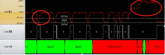 从图1地铁控制拓扑图可以知道,地铁屏蔽门一旦发生故障,我们可以考虑是否是由于PSC和DCU之间布线不规范造成的。 如图3所示,是用CANScope分析仪抓取的总线支线过长产生的波形。PSC与DCU之间的总线分支过长会出现导致上升沿和下降沿产生“台阶”现象,容易出现位宽度失调,从而造成PSC和DCU之间的通讯错误。