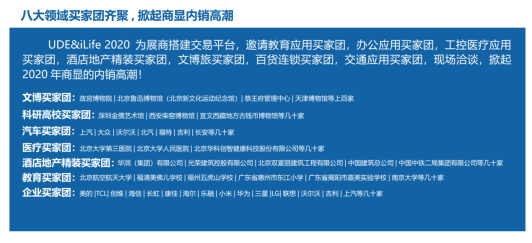 iLife2020为展商搭建交易平台,邀请数百家来自教育应用,办公应用,医疗应用,地产精装,汽车,文博旅,百货连锁,工控应用等买家团。