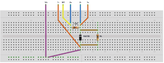 使用1N4735 6.2 V齐纳二极管在无焊面包板上构建图1所示电路。使用AWG1(5 V恒定)和–5 V Vn用户电源作为直流电源VIN。RL使用各种固定和可变电阻。
