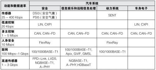 图 1:在汽车系统中,不同的总线和数据速率提供了必要的通信功能。