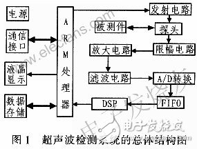 基于ARM超声波检测系统的总体结构框图,如图1所示。该系统主要由3部分组成:超声波前端发射接收电路、DSP和arm处理器。