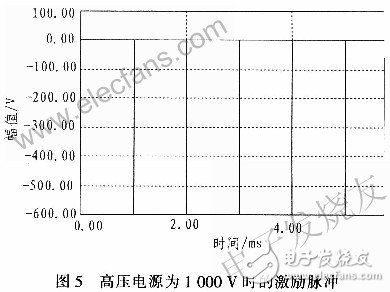 为验证本设计是否能满足实验的需要,对电路进行软件仿真。因为t=5τ1,约为500μs时认为充电电容充满,所以把开关频率设置为1kH-z。仿真结果如图4和图5所示。