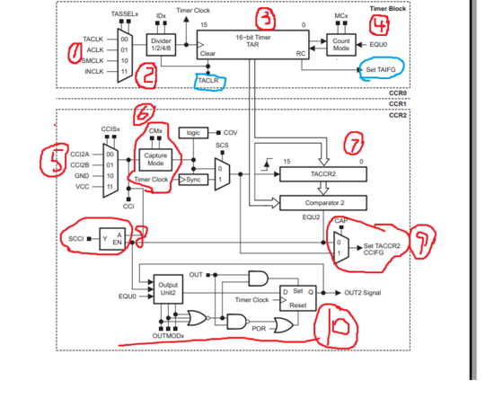 这里还是需要注意画蓝色的控制位,TACLR这个控制位是计数器还有定时器的复位控制位,如果这一位置位,则时钟源,分频比,还有计数器的方向都需要重新设定