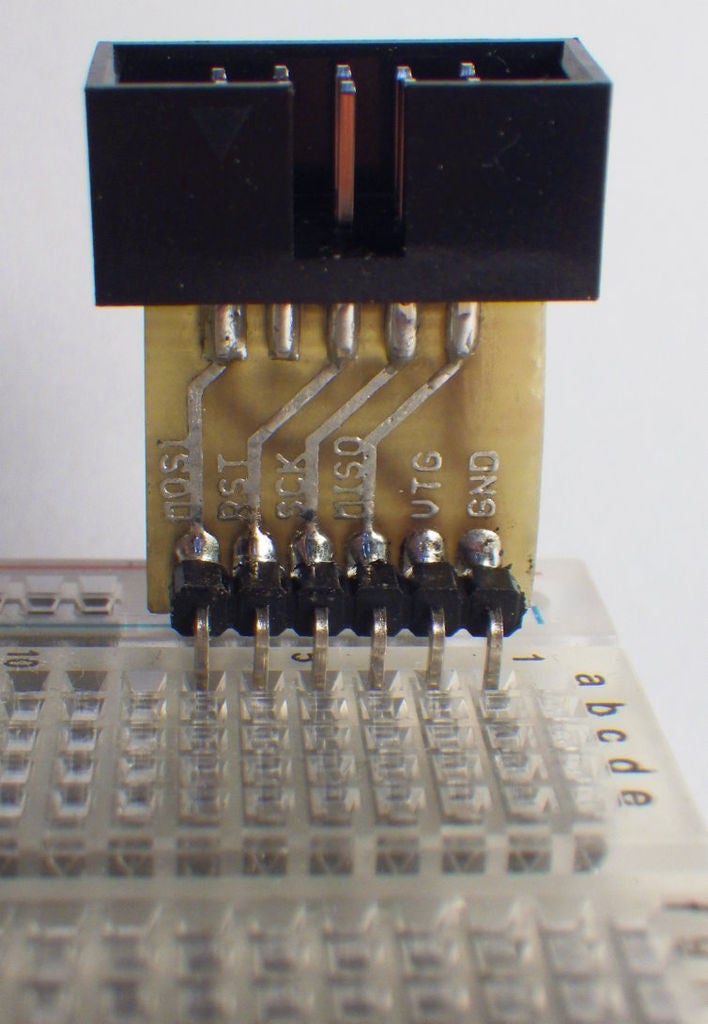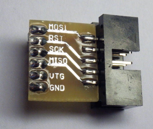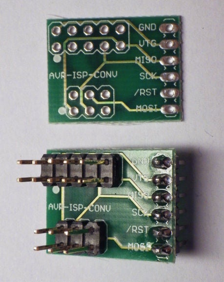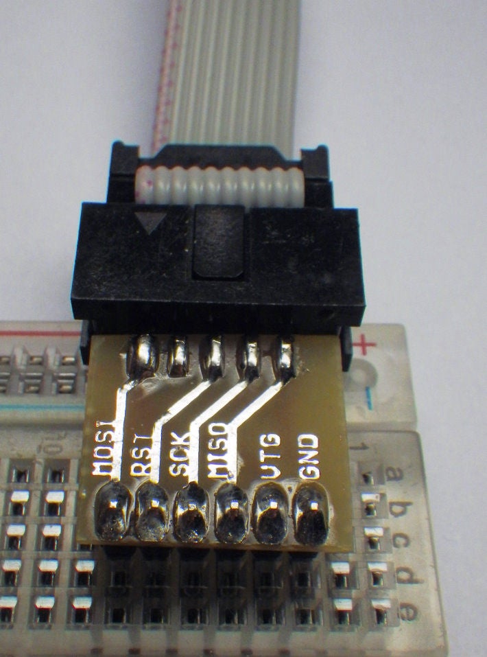 Sparkfun适配器作为一个裸露的电路板提供,您可以为6针和10针Atmel兼容ISP连接器配备简单的插头。使用极化IDC连接器使适配器几乎变得万无一失,因为您不会意外地以错误的方向连接ISP电缆。然后,开发板将4个ISP信号(MOSI,MISO,SCK和RESET)以及电源电压(GND和VTG/VCC)分到面包板上的六个引脚上。主要缺点是Sparkfun适配器在欧洲并不总是可以买到。