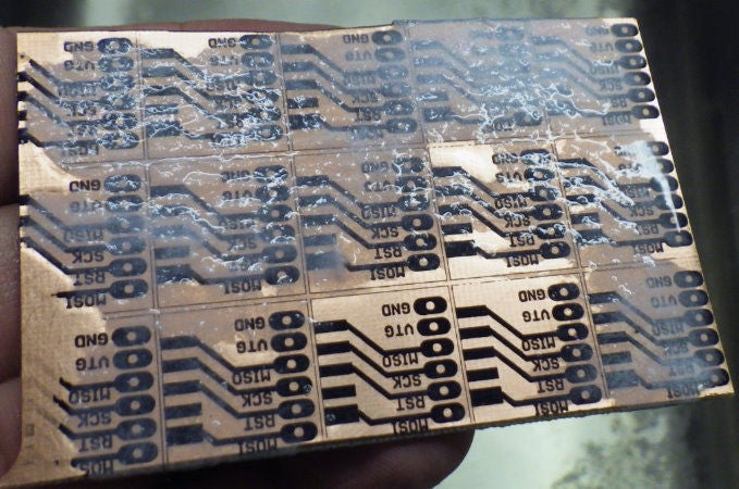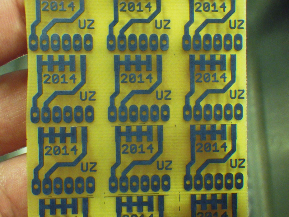 因此,我不得不使用家用熨斗,并且一侧的纸可能会滑一些。最后,它表明前后之间的对齐仅偏离了约1/2 mm,并且仅在一个方向上对齐。作为这种蚀刻剂,绝对足够好!