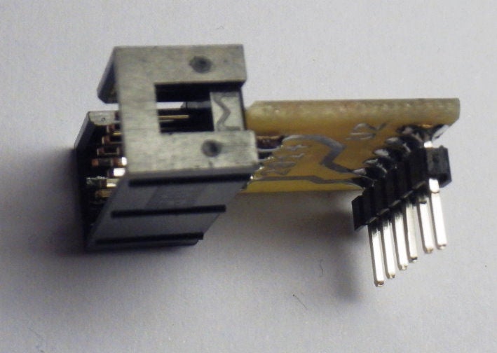 在这里没有太多要说的。焊接电路板有两件事:10针IDC连接器和6针插针。当然,您也可以只使用2x5排针而不是IDC连接器。在我的布局中,连接器的插针1在电路板上显示为较大的焊盘,标识了连接器和/或连接的电缆的正确位置。
