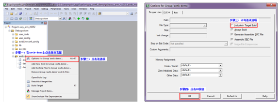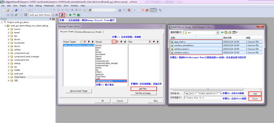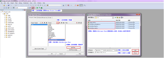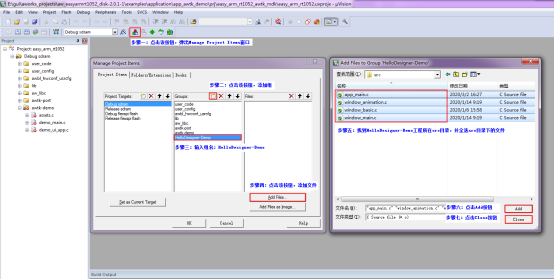 将HelloDesigner-Demo的源代码(通常在src目录下),添加到这个Keil工程中,可按下图所示操作。然后就可以编译和调试工程了。