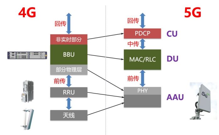 之前我介绍5G接入网技术专题的时候说过,4G基站主要是BBU、RRU和无源天线。5G基站,变成了CU(集中单元)、DU(分布单元)和AAU(有源天线)。
