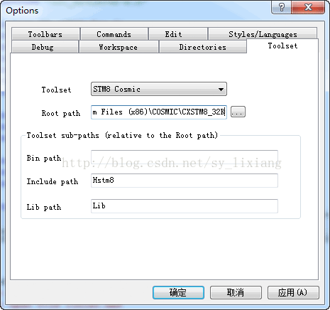 发生上述错误是因为编译器的工具链设置不对,打开Tools-Option,填写cosmic的路径,win7_64设置如下。确定后的所有waring都确定。