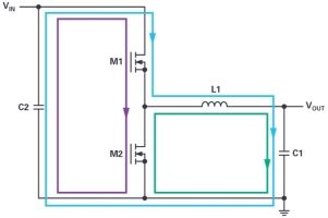 为了减少EMI,必须确定电源电路中的热回路(高di/dt回路)并减少其影响。热回路如图2所示。在标准降压转换器的一个周期内,当M1关闭而M2打开时,交流电流沿着蓝色回路流动。在M1打开而M2关闭的关闭周期中,电流沿着绿色回路流动。产生最高EMI的回路并非完全直观可见,它既不是蓝色回路也不是绿色回路,而是传导全开关交流电流(从零切换到IPEAK,然后再切换回零)的紫色回路。该回路称为热回路,因为它的交流和EMI能量最大。