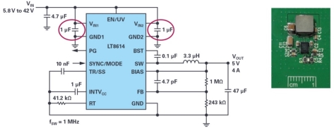 图6.典型的Silent Switcher应用原理图及其在PCB上的外观。