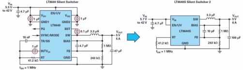 图7.Silent Switcher应用与Silent Switcher 2应用框图。