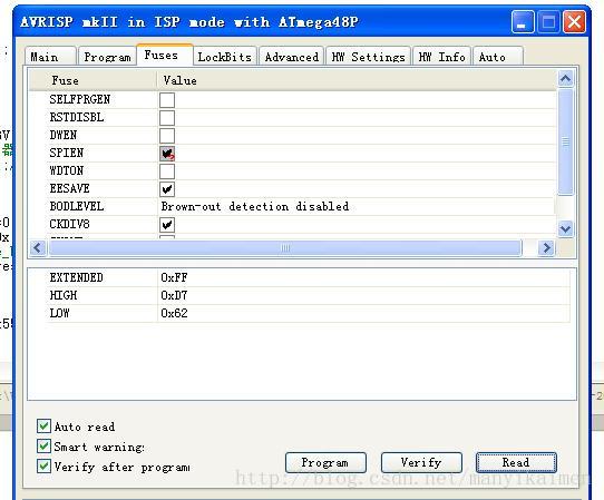 #include #include #include #include #include #include #include #include int main(void) { uint8_t Edata=0; uint16_t t = 0x19F; //eeprom_write_byte((uint8_t*) t,0x55); Edata=eeprom_read_byte ((uint8_t*) t ); } //写入再读出,验证即可。 我是写入之后,把写那一句注释掉,再少些看能否读到同样值,但是每次烧写之后都都不到同样值,why? 原来是每次烧写的时候把eeprom也擦除了,解决方法如图: 勾选了eeprom之后少些程序就会保留eeprom啦