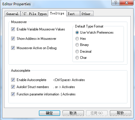 1.打开 Editor =》Properties... 菜单,选 Tool tips 标签,选中 AutoComplete;