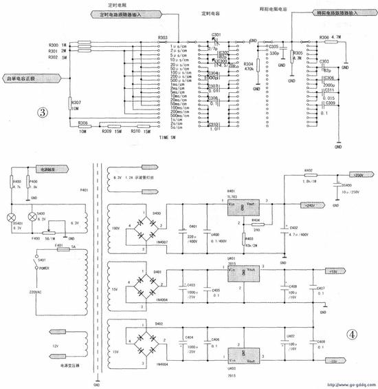 首先接上电源变压器,要求中低压电源可以产生稳定的+240V、+15V、-15V、+5V、-5V电压。一般+15V、-15V、+5V、-5V不会有什么问题,如果+240V电压有较大偏差,则应调整TL783的adj管脚的电阻阻值,由于该电阻上的电压较高,功耗较大,故应使用2W以上电阻。另外,TL783输出端的滤波电容不要太大,几微法就足够了,太大可能会导致该电容充电时TL783上压差过大而损坏(TL783只能耐受125V压差l。示波管灯丝的6.3V变压器绕组要有可靠的绝缘,以防击穿。