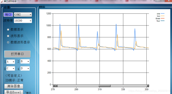 主函数中实时采样AD端口的波形值,然后将采样值经过加权递推平均滤波法进行滤波,然后用串口输出原始采样值和滤波后的值,并在串口波形软件上显示采样的数据波形。