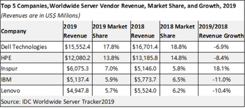 戴尔、HPE、浪潮位列 2019 年全球服务器市场的销售额前三,戴尔占比 17.8%,销售额同比下降 6.9%;HPE 占比 13.8%,销售额下降 8.4%;浪潮占比 7%,销售额增长 18.1%,是全球唯一保持两位数增长的服务器厂商。