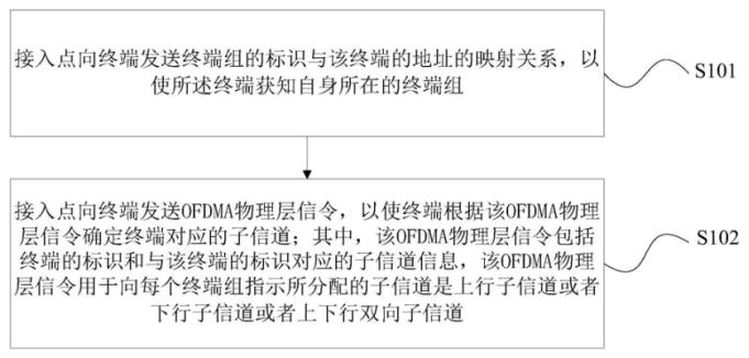 其次,接入点向终端发送OFDMA物理层信令,以使终端根据OFDMA物理层信令确定终端对应的子信道,其中OFDMA物理层信令包括终端的标识和与该终端的标识对应的子信道信息,OFDMA物理层信令用于向每个终端组指示所分配的子信道是上行子信道、下行子信道或者上下行双向子信道中的一种。