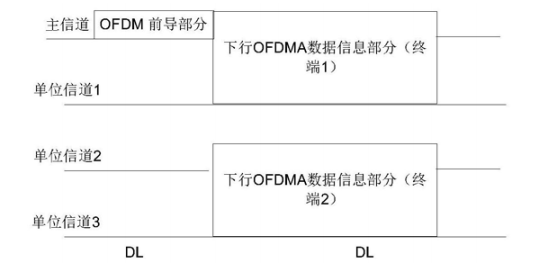 如图所示,接入点采用OFDMA模式在终端对应的子信道上发送下行OFDMA数据信息;其中,该下行OFDMA数据信息包括:OFDMA前导和OFDMA数据,该OFDMA前导包括切换域、超高吞吐量信令(UHT-SIG-B),同时我们注意到单位信道被划分为了多个子载波,一个载波对应一个终端。