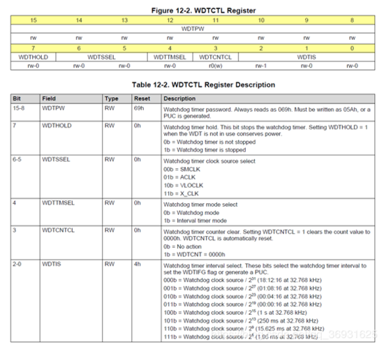 WDTPW:首先看这个寄存器的高八位,是WDT的密码,在操作这个寄存器时,必须同时输入密码(5Ah),否则写任何数字都会导致看门狗复位程序。(注意,是同事写入不是先写密码,再操作寄存器) 同时这个高八位密码寄存器的读取结果一致都是69h。