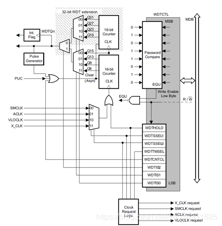 由上图结构图中可以看出,MSP430 MCU内部会提供一个PUC信号,用于清除看门狗计数器,这也就是外部看门狗所描述的喂狗操作,当程序跑死后,这个信号没有产生,因此当看门狗定时器定时时间到时,则会产生一个复位信号,使得系统重新启动。同时看门狗计数器的时钟源可以由用户进行选择。